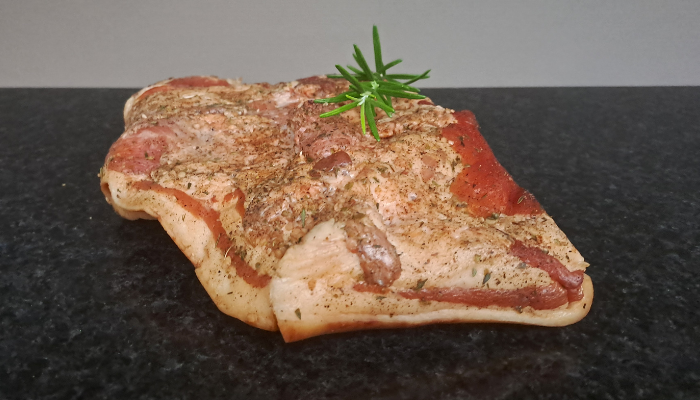 Gemaakt van varkenswangvet met zout, oregano, salie, knoflook, bruine suiker en peper